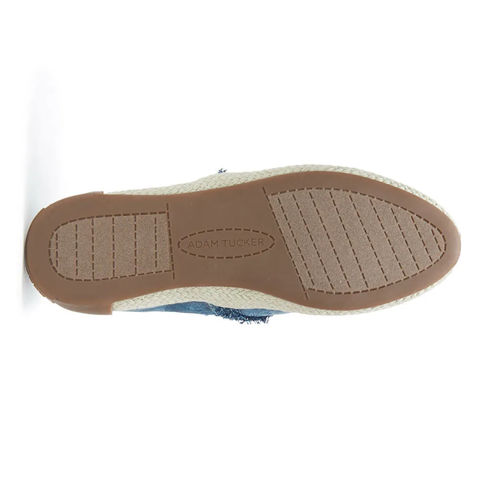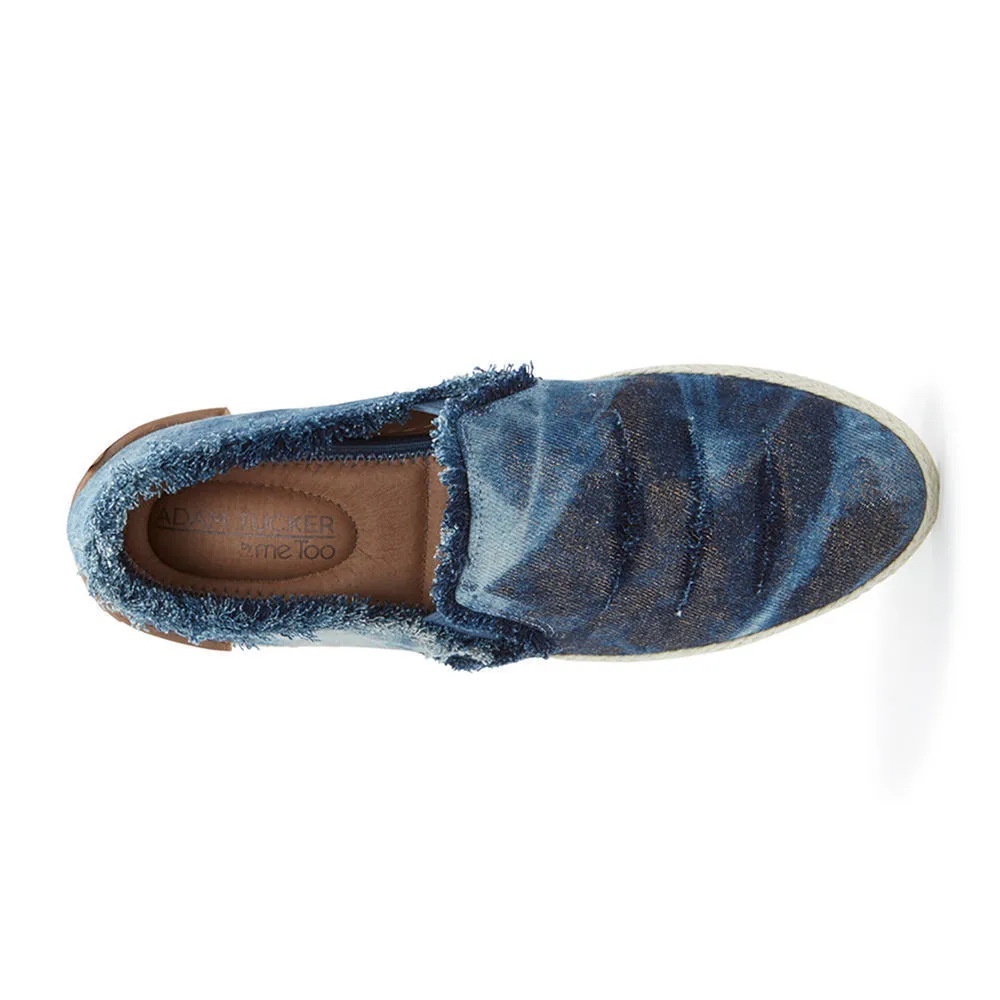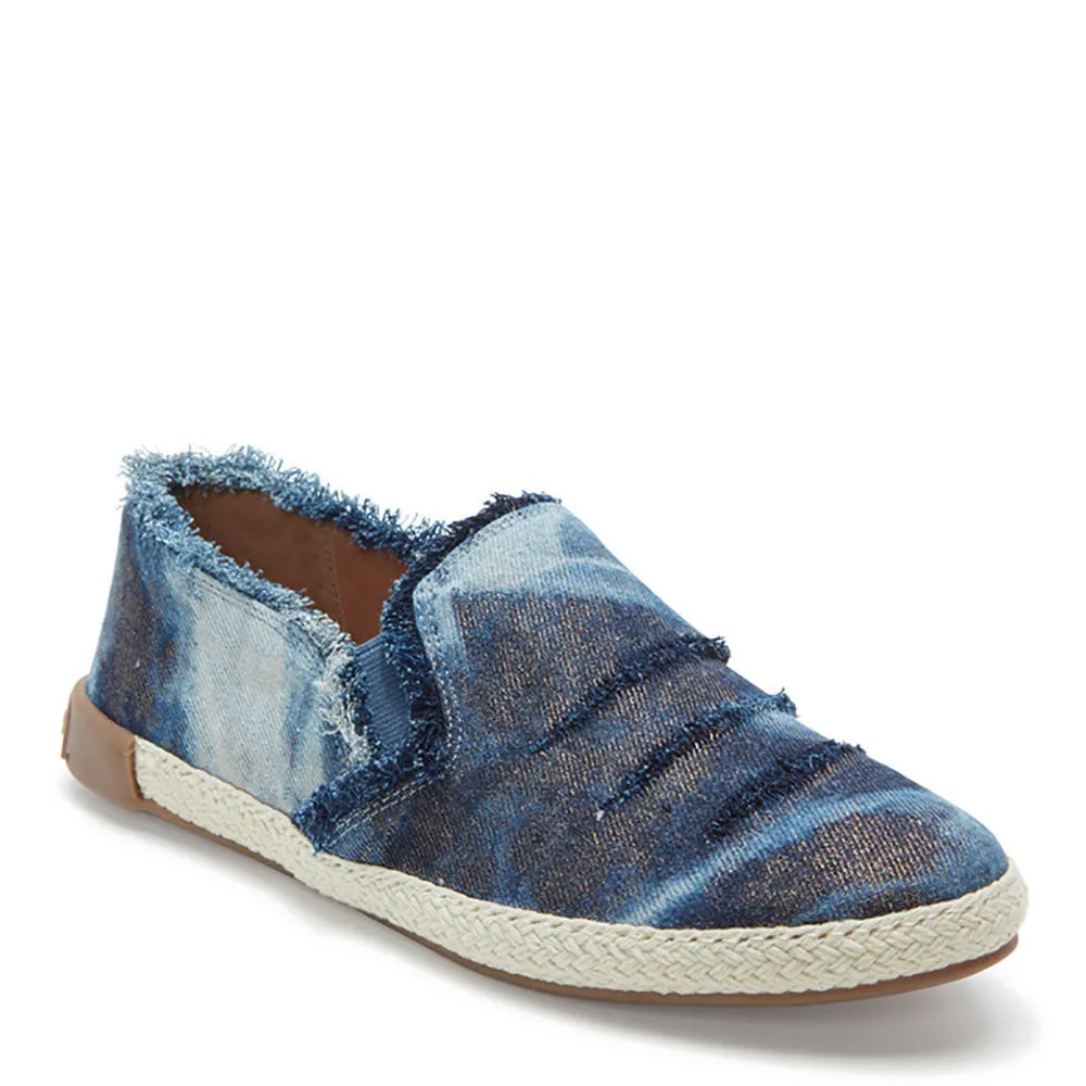 Frayed edges enhance the laid-back style of a versatile slip-on sneaker grounded by a rubber sole with braided rope trim.