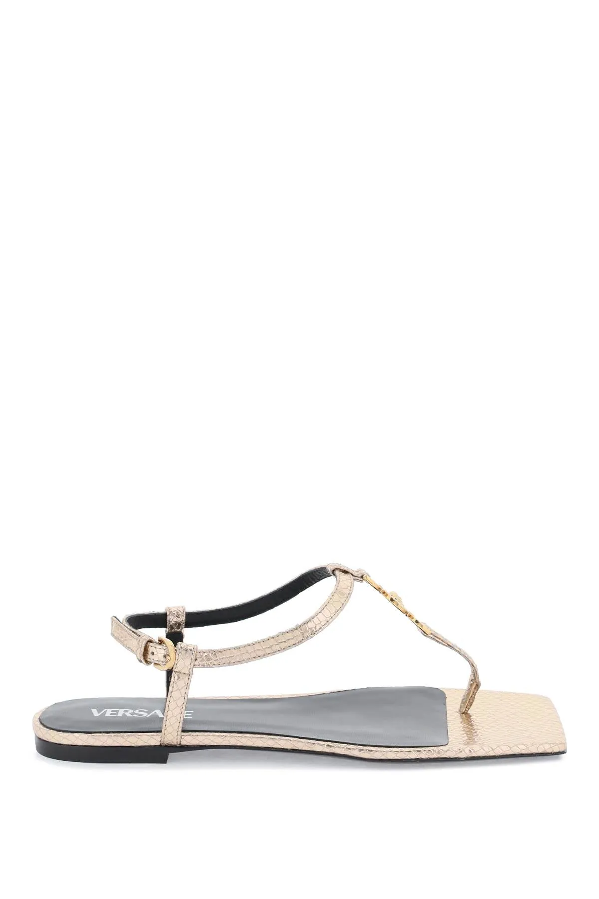 Versace thong sandals made of snake-effect laminated leather with gold metal Medusa detail embellished with crystals. Adjustable ankle strap, leather footbed and leather sole.
